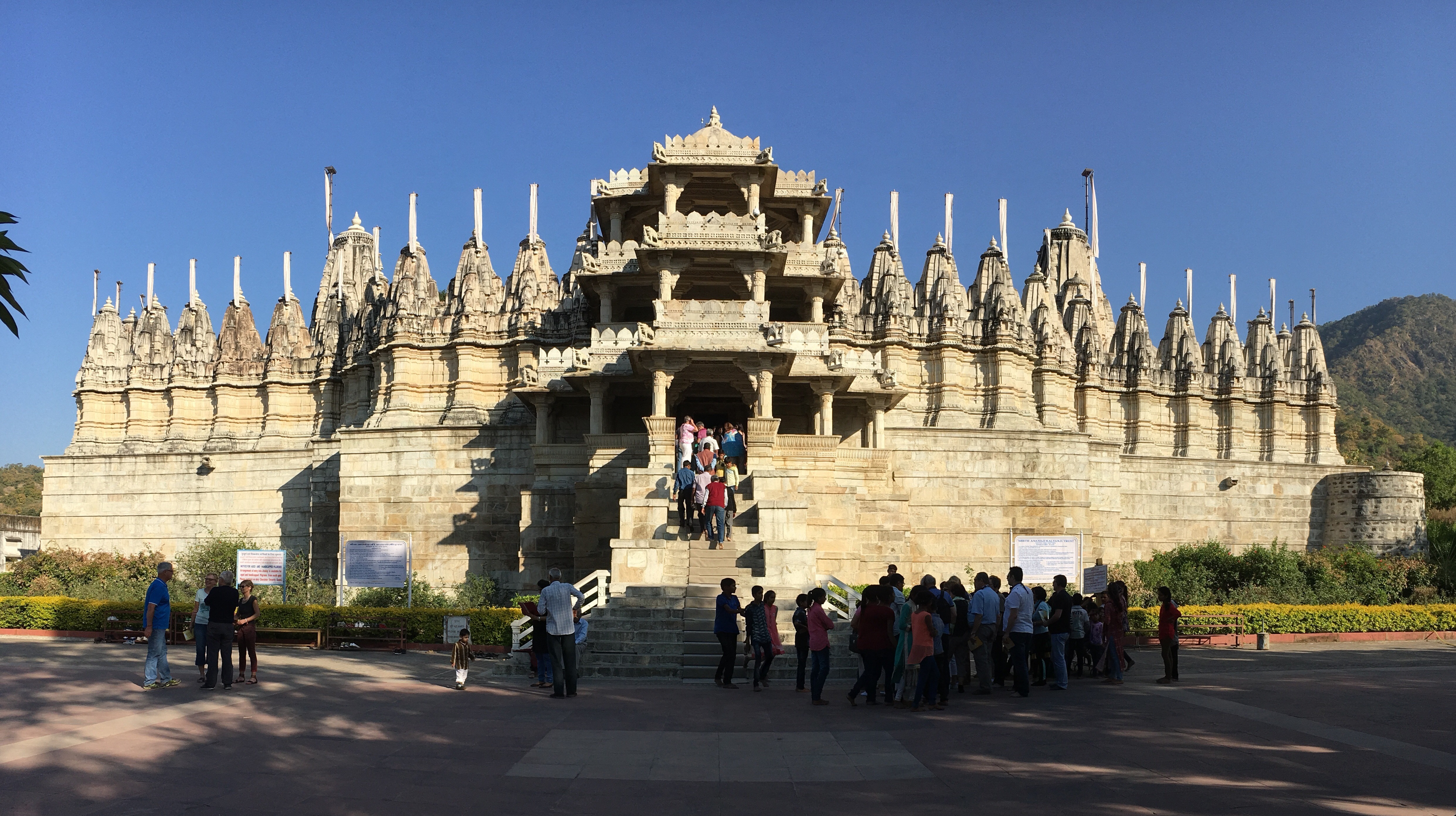 Stosunkowo niedaleko od fortu znajduje się jedna z największych dżinijskich świątyń Ranakpur. Jest imponująca: zarówno pod względem rozmiarów jak i zdobień. Obowiązuje całkowity zakaz jedzenia, wnoszenia przedmiotów ze skory i fotografowania świętych posągów. W świątyni jest las kolumn (ponad 1400), marmurowych z pięknymi zdobieniami. Dużym plusem jest możliwość skorzystania z audio guida bo świątynia przepełniona jest dżinijaską symboliką. 2 godziny na zwiedzanie na pewno nie będzie za dużo.