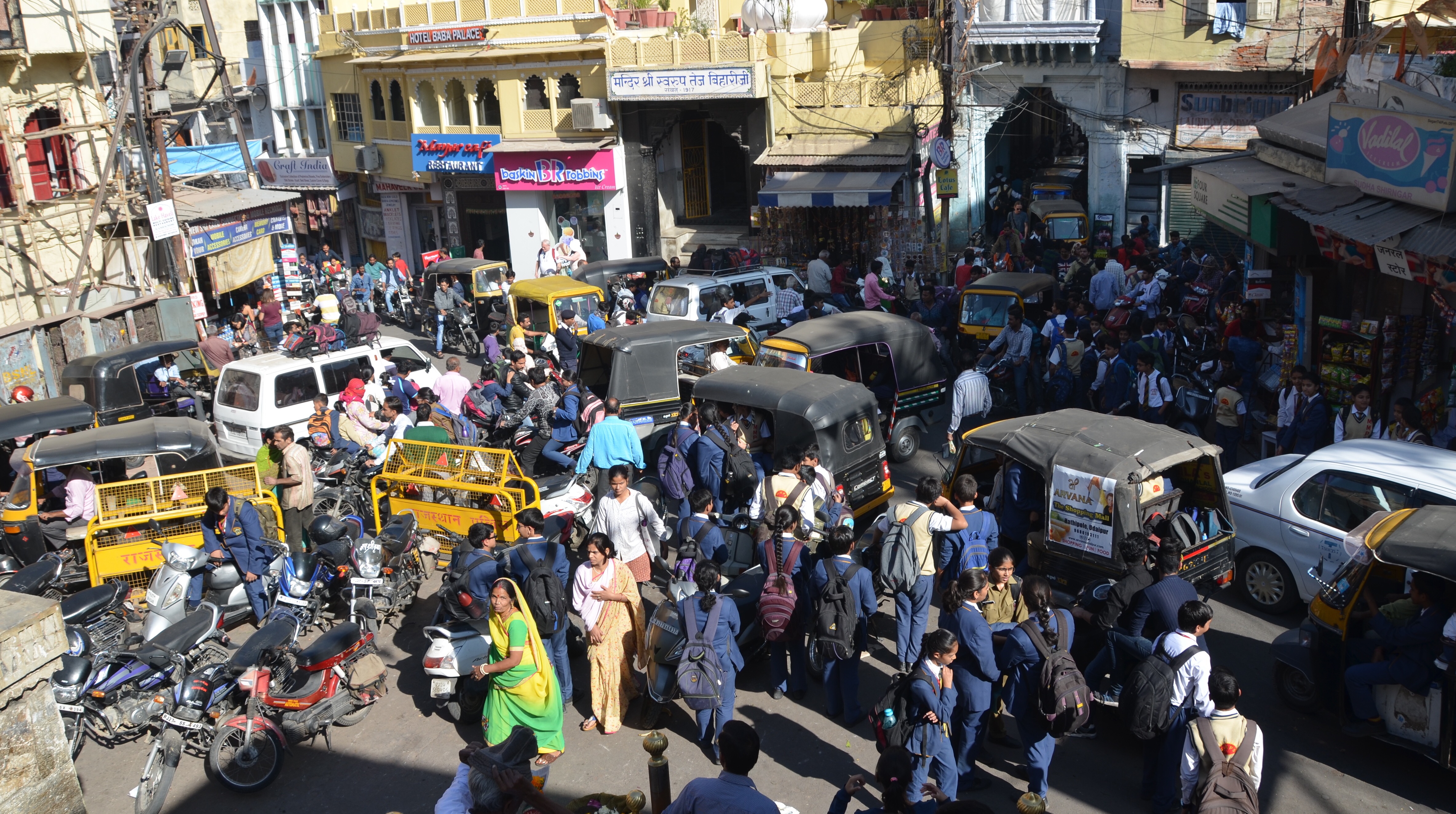 Centralnym punktem staromiejskiego rozgardiaszu jest skrzyżowanie 4 ulic przy głównej świątyni hinduistycznej Jagdish Temple. Piękne miejsce gdzie można być świadkiem codziennych obrzędów (zwłaszcza wieczorem) oraz podziwiać ściany pokryte typowymi lekko świntuszującymi hinduskimi płaskorzeźbami. Świątynia jest na szczycie stromych schodów skąd jest doskonale miejsce do obserwowania ulicznego życia. Udajpur to miasto gdzie wiele osób chciałoby mieć wesele dlatego całkiem prawdopodobne jest, że w trakcie pobytu spotkamy orszak weselny, który na pewno będzie przechodził pod świątynia. Niezapomnianym widokiem jest ruch uliczny około godziny 14 gdy dzieci wracają ze szkół. Na skrzyżowaniu tworzy się wtedy rikszowy węzeł gordyjski, którego niezwykłość podkreśla kakofonia klaksonów.