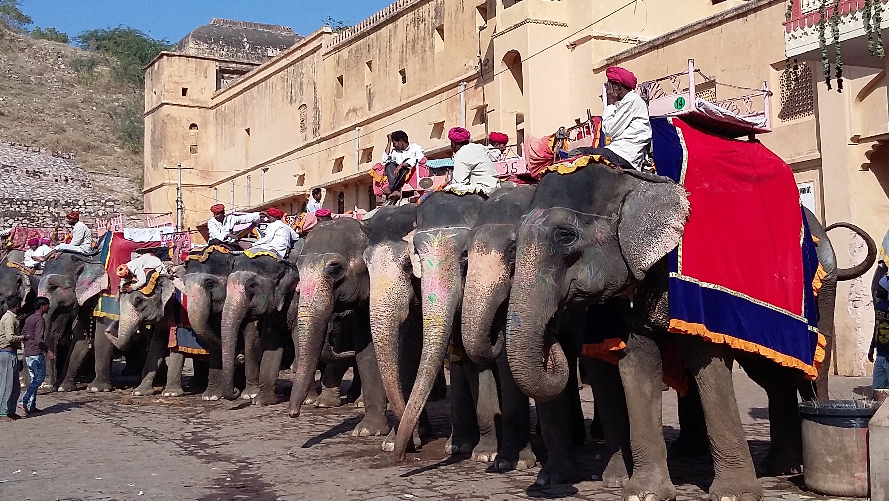 Jaipur oferuje pare ciekawychmiejsc do zwiedzania. Zdecydowanym numerem jeden, na który trzeba przeznaczyć pół dnia jest Amber Fort leżący kilka kilometrów za miastem (dojazd tuktukiem za około 5$ w obie strony). Fort jest faktycznie okazały i daje wyobrażenie o potędze panujących tam władców. Niewątpliwa aczkolwiek nie tanią atrakcją jest wjechanie do fortu na słoniu (1000r od pary). Trwa to około 15 minut i oszczędza długiego i mozolnego wspinania się po schodach. Warto pamiętać: mahud czyli kierowca słonia oczywiście oczekuje napiwku chociaż jest to zakazane. Rownież uczynny pan pod koniec przejażdżki, który zrobi nam pare zdjęć naszym aparatem stanowczo poprosi o uiszczenie stosownej opłaty. Na szczęście wracając z fortu (po około 3 godzinach) zrobimy to na własnych nogach podziwiając przy okazji widoki i napawająca się bliskim kontaktem ze sprzedawcami pamiątek i właścicielami śpiących na schodach kóz (właściciel tych zwierząt ujawni się błyskawicznie w momencie gdy zechcemy czerpać korzyść z głaskania jego capiących futrzaków).