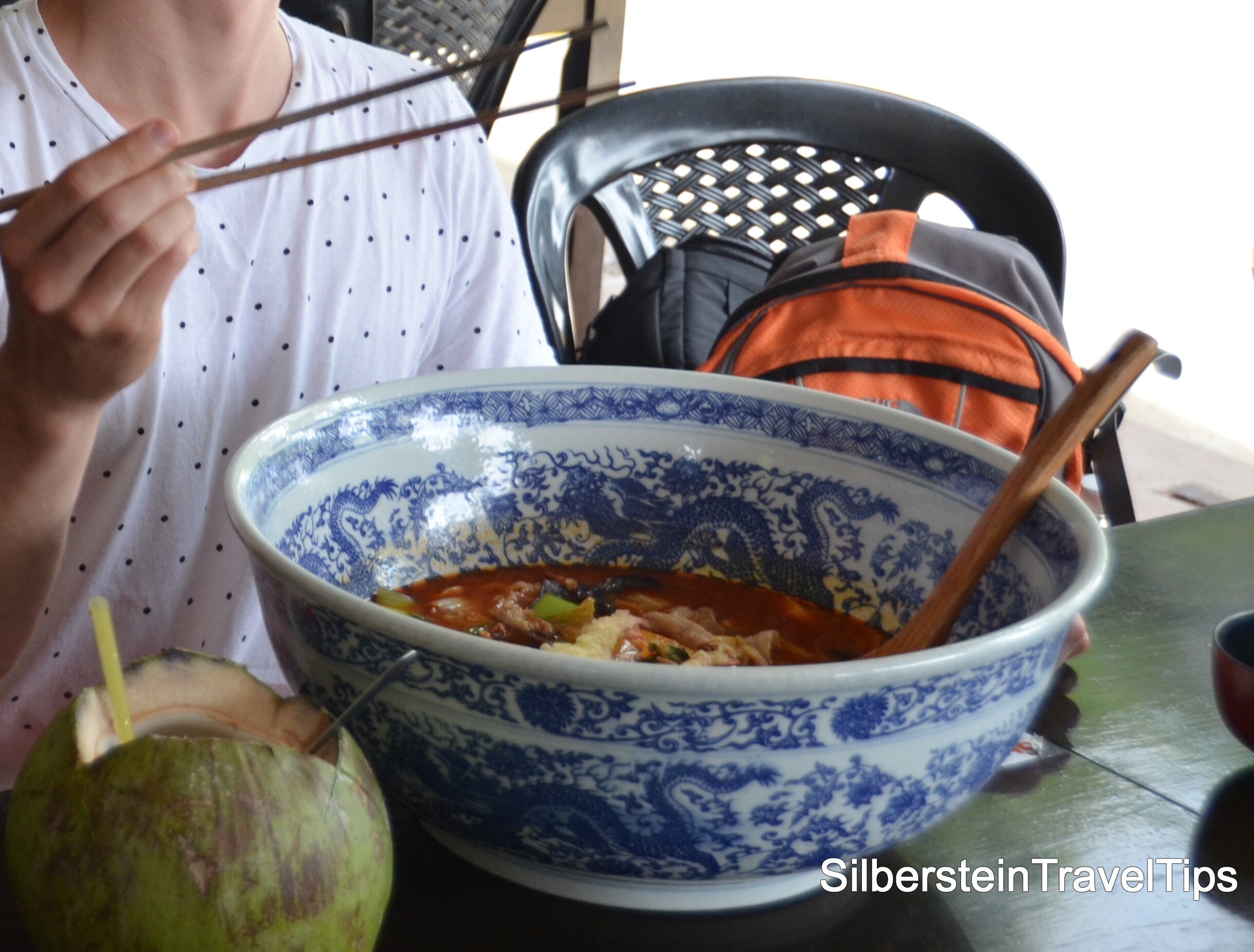 Kek Lok Si to z kolei zespół świątyń buddyjskich nadal jeszcze rozbudowywanych. Miejsce nie tylko turystyczne lecz również ważne dla tutejszych wyznawców. Na wizytę musimy liczyć przynajmniej dwie godziny. Co w tym kontekście w pełni naturalne należy się przed zwiedzaniem pożywić korzystając np. z dość znacznego kompleksu straganów głównie z chińskim jedzeniem, który będziemy mijać w drodze z autobusu. Nie sposób nie zauważyć straganu oferującego doskonała zupę w potężnych wazach (tak na oko o pojemności 7litrow, oczywiście wypełnionej stosownie do ilości osób zamawiających). Nie ma strachu, zupkę nalewamy z ogromniastej michy do mniejszych gustownych miseczek.