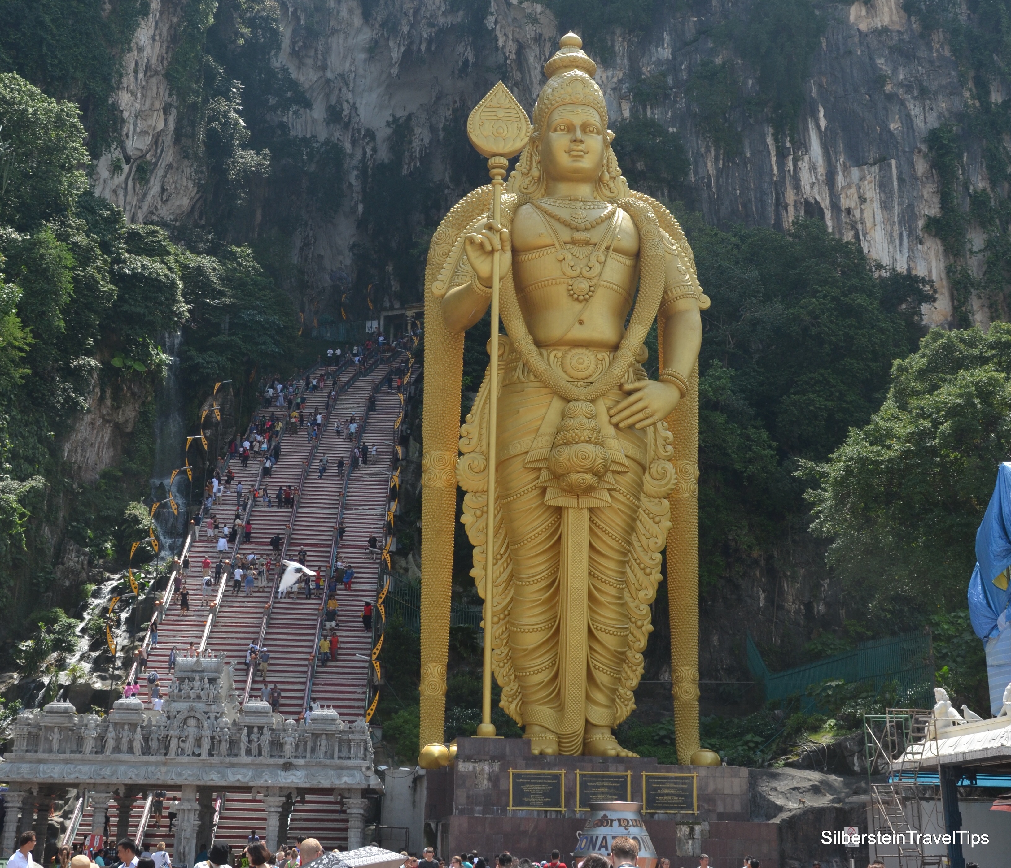 O godzinę jazdy pociągiem znajduje się ważne dla hindusów miejsce czyli Batu Caves. Dojazd za grosze pociągiem Komuter z KL Sentral i wysiadka na stacji końcowej. Jest to bardzo ważne dla hindusów miejsce kultu, gdzie co roku w święto Thaipusam przybywa grubo ponad milion pielgrzymów. Sądząc po licznych relacjach jest to dość wymagająca pielgrzymka (Np. tutaj). Sanktuarium, którego główna cześć znajduje się w pięknej jaskini do której wiodą strome schody poświęcone jest bogowi Muruganowi, który za wyjątkiem Indii Południowych (wiemy wszak, ze w Malezji jest znaczna reprezentacja Tamilów z południa Indii) jest znacznie mniej znany od swojego brata Ganesi ( to ten z głową słonia) i ogólnie rzecz biorąc jest bogiem wojny dzierżącym w ręku swoją magiczna włócznie, która dostał od mamy Parwati (małżonka Siwy, która w swojej okrutniejszej wersji znana jest bardziej jako Kali tudzież Durga). Oprócz głównej świątyni jest kilka pomniejszych kaplic, centrum z pamiątkami oraz wielgachny posąg wodza małpiej armii czyli Hanumana.
