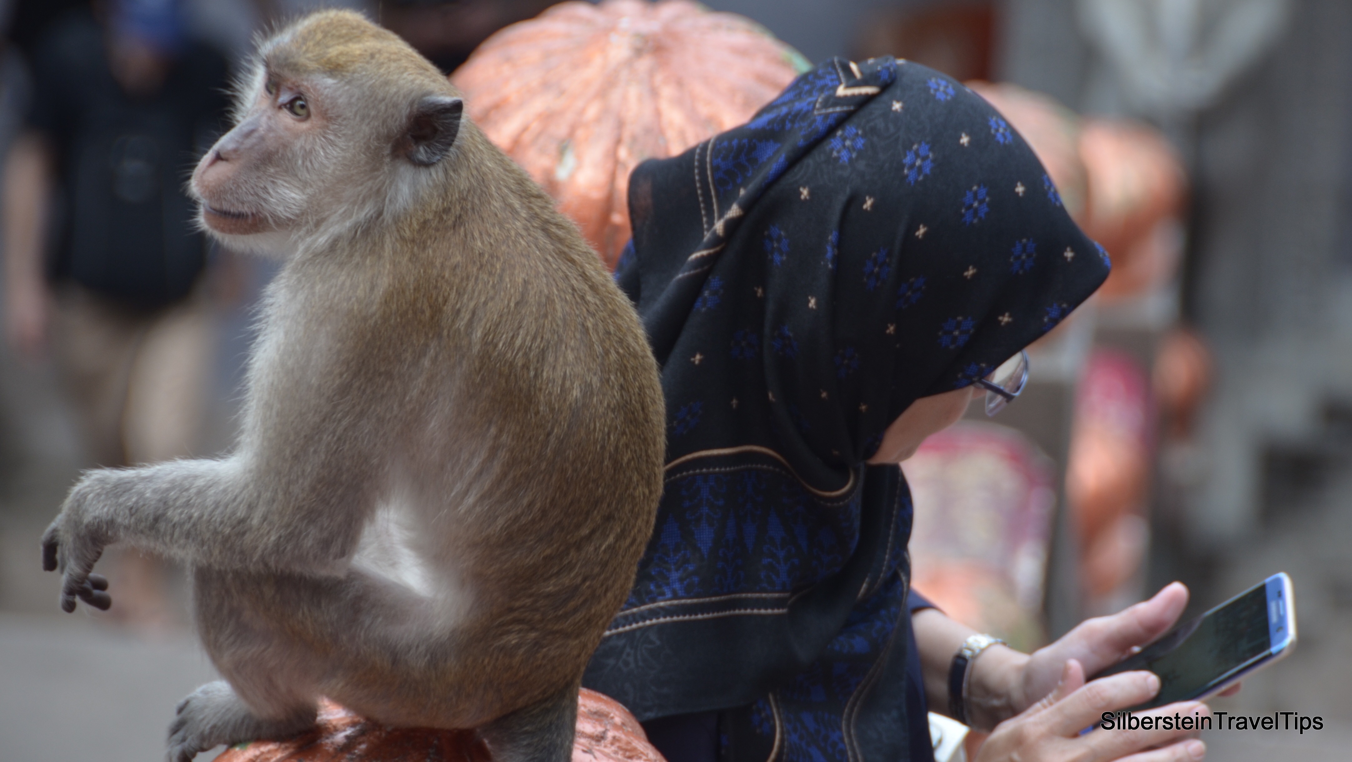 A propos małp…Będą nam towarzyszyć od opuszczenia dworca. Idąc po schodach niekiedy trzeba się od nich opędzać bo jest to ich teren polowania na jedzenie. Są miłe, zwłaszcza te z małymi do czasu kiedy nie pokażą pokaźnych kłów. Przekonał się o tym jeden z turystów wydających dźwięki w języku rosyjskim, który dał małpie kokos aby zrobić zdjęcie jak małpka bawi się orzeszkiem. Szkoda tylko, że potem chciał orzech małpie zabrać. Naprawdę imponujące kły…i paszoł won.
