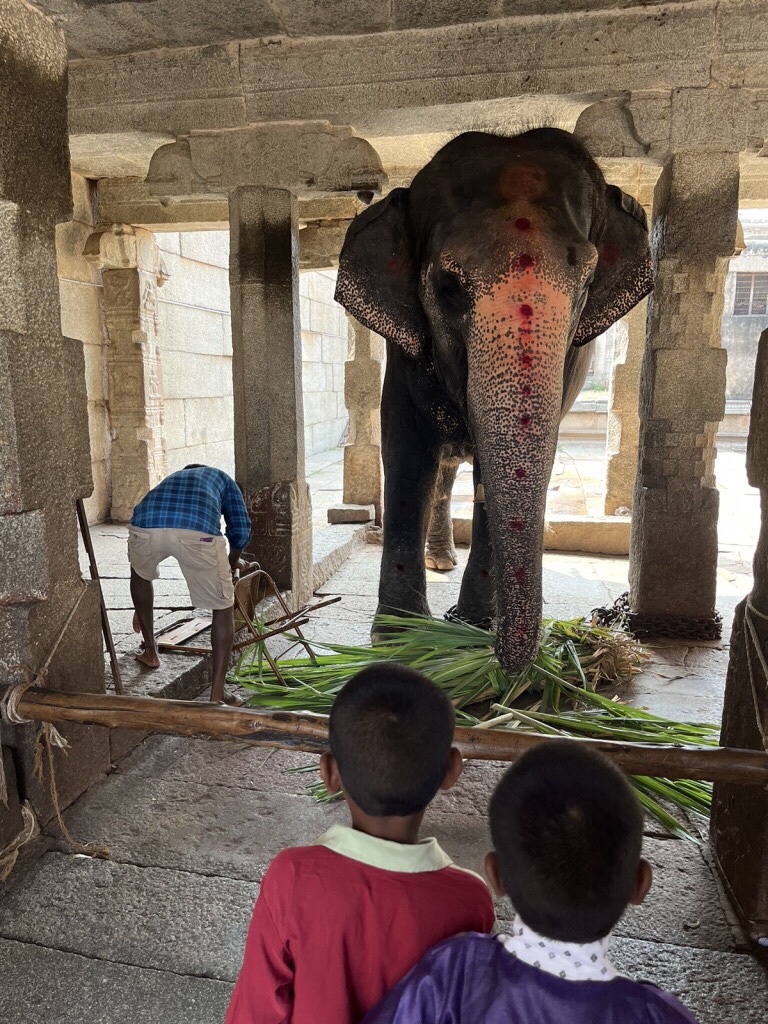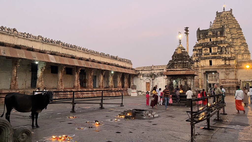 Praktycznie większość świątyń w Hampi to muzea. Lub jak mówią tutejsi: „Sir, no God here, Sir”. Bez wątpienia prawdziwą żywą świątynią jest Virupaksha poświęcona Sivie. Codziennie rano i wieczorem odbywa się tutaj puja, czyli modlitewna ceremonia. Z tego powodu, ze to nie muzeum można tu wejść jedynie na bosaka. I warto uważać, bo na posadzkach jest ślisko od oliwy z lampek ofiarnych. Jednym z bardziej słynnych lokatorów świątyni jest słonica Lakshmi, która za drobną opłatą może pobłogosławic trąbą. Chętnych nie brakuje. Krowy tez tam są zawsze. A na gopurach zobaczysz siedzące małpy oraz sowy.
