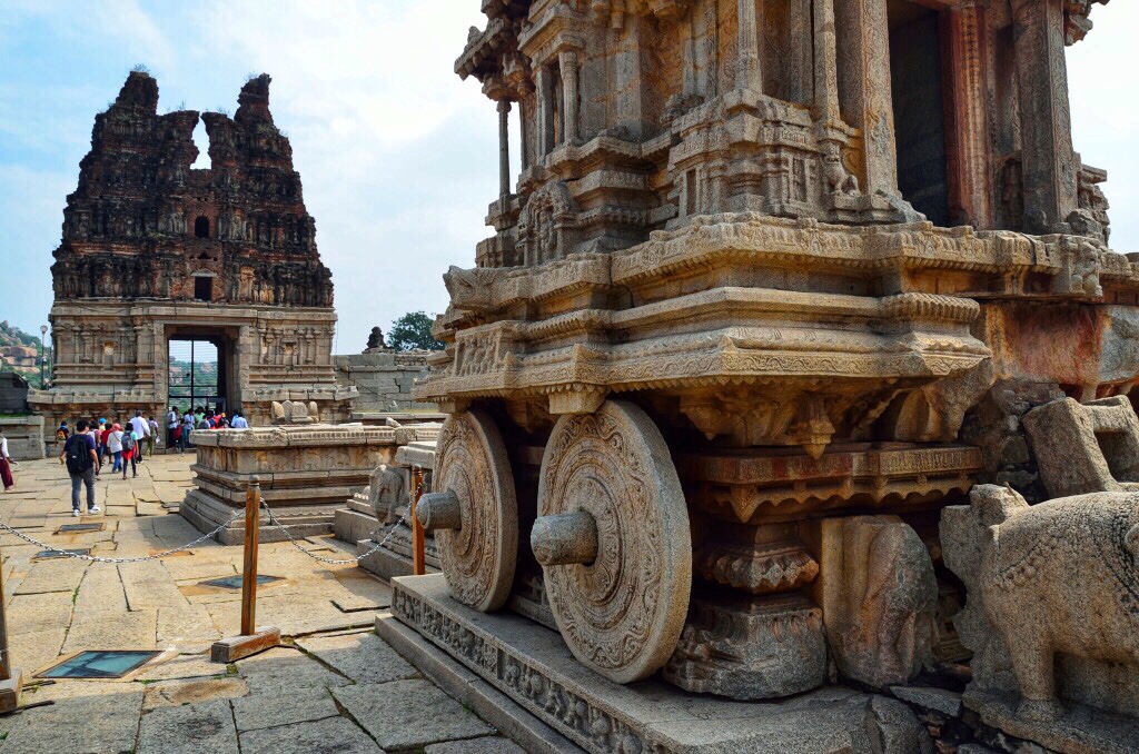 Vittala jest znana przede wszystkim z potężnego kamiennego powozu, który ciągnięty jest przez pare słoni. Jak dobrze się przyjrzeć to słonie zostały dostawione później zastępując oryginalne konie, których kawałki tylnich nóg można jeszcze dostrzec. Przed powrotem ze świątyni (wracamy również meleksem) zachęcam do krótkiego spaceru szlakiem w kierunku Hampi Bazaar. Na samym początku dochodzimy do pozostałości po kamiennej wadze królewskiej, na której odważano ilość złota równą wadze króla.