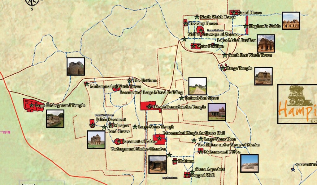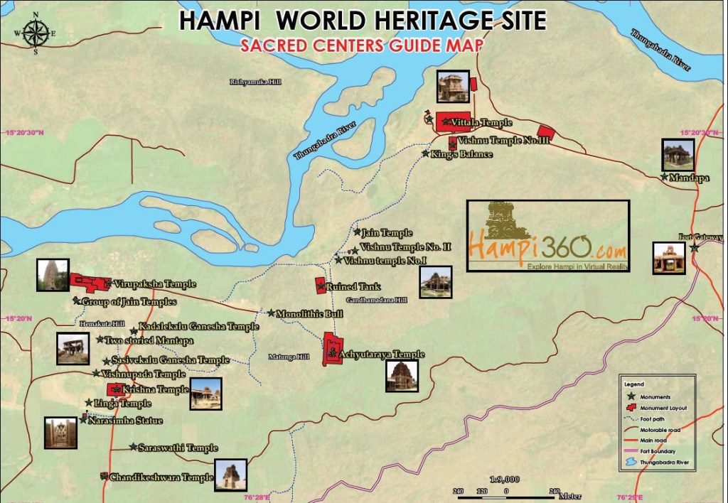 Dość rozległy obszar Hampi to wielki park archeologiczny, na którym znajdujemy pozostałości po stolicy imperium. Pozostałości z różnych okresów i w rożnym stanie zachowane. Żeby nieco uporządkować i łatwiej ogarnąć temat pod kątem zwiedzania możemy skupić się na głównym i najciekawszym obszarze obejmującym centrum sakralne oraz centrum królewskie. Oba sektory oddalone są od siebie o pare minut jazdy skuterem. Znajduje się w nich kilkadziesiąt mniej lub bardziej istotnych obiektów a zwiedzenie wszystkiego to 2 dni, praktycznie od rana do wieczora.
