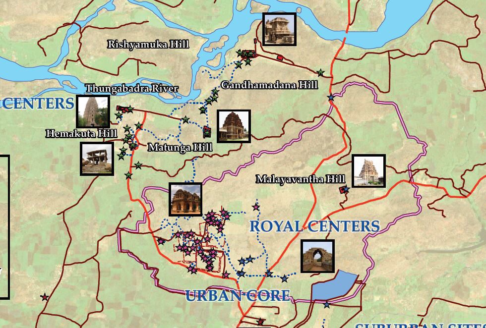 Centrum sakralne to obszar skupiony wokół Hampi Bazaar na południe od rzeki. Są to dwa główne punkty odniesienia: na zachodzie świątynia Virupaksha ku czci Sivy a na wschodzie Vittala poświęcona Vishnu i słynąca z kamiennego wozu. Między jedna a druga prowadzi ok 2km pieszy szlak wzdłuż rzeki. Absolutnie nie przejedziemy tedy ani skuterem ani rowerem. Oprócz świątyń mamy tutaj 2 wzgórza z przepięknymi widokami na okolice polecane zwłaszcza na zachody słońca. Analogicznie, tylko pieszo. Sama miejscowość Hampi Bazaar oferuje tanie noclegi oraz całkiem sporo miejsc do jedzenia. Stąd również dojdziemy do rzeki oraz do przeprawy promowej.