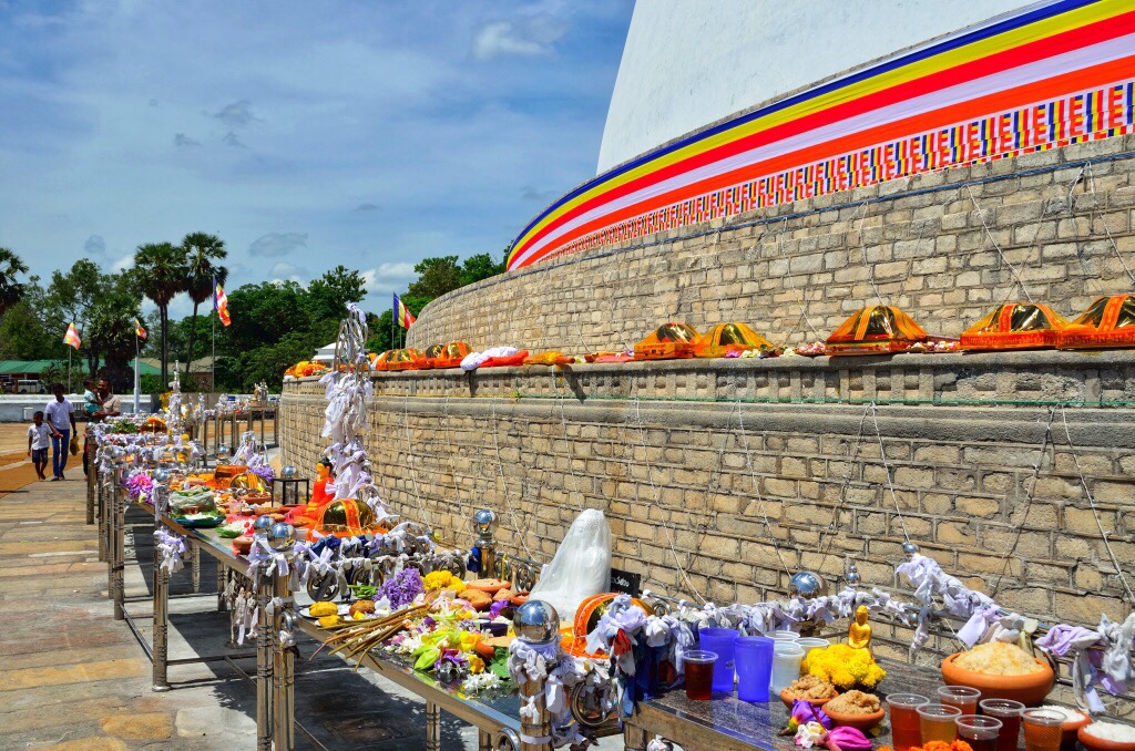Na terenie świątyń buddyjskich zwykle jest stupa (możesz nazwać ją dagobą). Zwykle, np. w Anuradhapurze jest po prostu potężna. Jak piramidy w Gizie. Zwyczaj nakazuje aby obchodzić ją wokoło zgodnie z ruchem wskazówek zegara zatrzymując się przy różnych kapliczkach aby złożyć w skupieniu ofiarę np. z kwiatów. Jeżeli jest to bardziej uczęszczany kompleks możesz liczyć, że wokół stupy będzie rozścielony jutowy chodniczek, który nieco złagodzi doznania związane z chodzeniem po rozpalonych węglach.