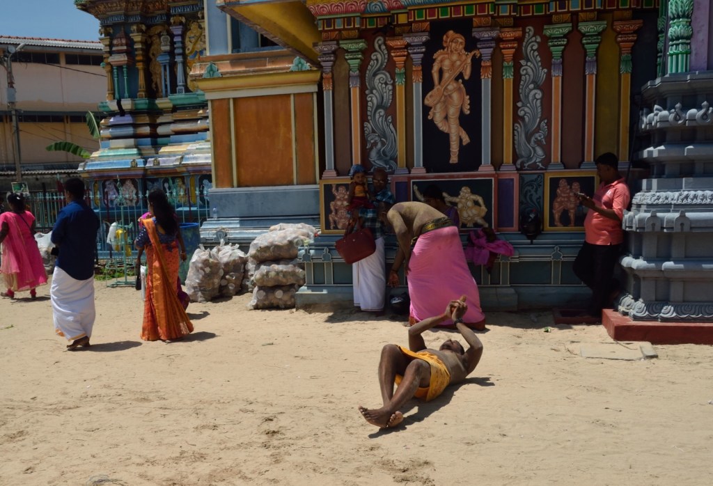 Na zewnątrz światyni Durgi też wiele się dzieje. Kilku wiernych okrąża światynię (również zgodnie z ruchem wskazówek zegara) czołgając sie lub raczej przetaczając po piasku. Inni chodząc wokoło co chwila padają na kolana i biją pokłony. Miedzy nimi chodzą grupki pań ubranych w kolorowe sari żywo i ze śmiechem ze sobą gaworzące. Do sąsiadującego budynku ustawiła się juz kolejka po darmowy ryż z warzywami, a że nie dla wszystkich wystarczy więc atmosfera jest dość ożywiona. Zza rogu wysuwa się potężny drewniany wóz z wizerunkiem bóstwa ciągniety i pchany przez półnagich mężczyzn. A tuż za ogrodzeniem z rykiem klaksonu przejeżdża pospieszny autobus do Jaffny.