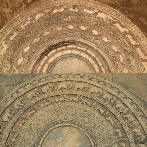 Do symboliki buddyzmu nawiązują też typowe dla Sri Lanki kamienie księżycowe. Odwiedzając Kulturowy Trójkąt (o czym więcej tutaj) jest okazja aby je zobaczyć. Zwykle umieszczane były jako przedproża przed świątyniami lub pałacami. W symboliczny sposób przypominały jakie przeszkody trzeba pokonać aby dojść do celu czyli osiągnąć nirwanę symbolizowaną jako kwiat lotosu. Zwróć uwage na wizerunki zwierząt odpowiadające róznym etapom życia człowieka: słoń, koń, lew i byk. Jak porównasz starsze kamienie księżycowe z Anuradhapury z tymi późniejszymi w Polonaruwie zauważysz brak byków na tych ostatnich. Coż, Sri Lanka często była najeżdżana przez sąsiadów z Indii a własnie w Polonaruwie zagościli oni na dłużej. Dla hindusów symbol byka jest świety i nie wypada aby po nim chodzić. Ale mało tego, nie zobaczysz również lwa, który jest dla Singalezów równie święty.