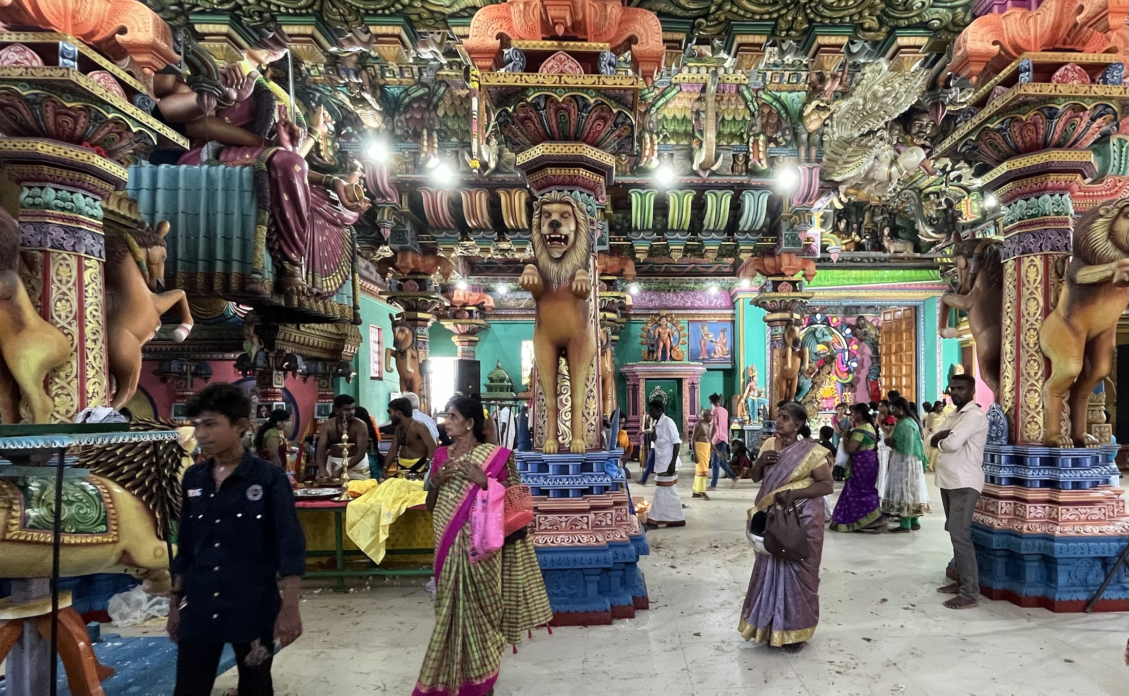 Jadąc z Trinco na północ – tak jak ten ryczący autobus do Jaffny – po paru kilometrach natykasz się na złoto-niebieską świątynię hinduską. Również i tutaj charakterystyczna gopura chociaż tym razem złota. Zaskakuje natomiast to, że samo zdjęcie butów tu nie wystarczy. Panowie również proszeni są o zdjęcie koszul. Wchodzimy do wisznuickiej światyni Lakshmi Narashima. W odróżnieniu od światyni Durgi, która jest światynią wyznawców panteonu bóstw z “linii” Shivy, tutaj napotykamy postacie powiązane z Wishnu: Narashima o twarzy lwa, dzielny małpi generał Hanuman czy niebieskolicy Krishna. Tutaj wewnątrz zdjęć się nie robi a chodzi się po świątyni również zgodnie z ruchem wskazówek zegara.