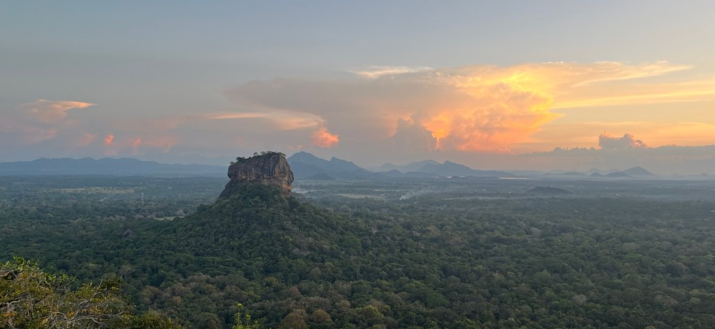 Dodatkowo niezwykłość tego miejsca można docenić udając się na odległą o około 3km drugą skałę: Pidurangalę. Widok zapiera dech w piersiach, zwłaszcza w trakcie zachodu słońca. Samo wejście na Pidurangalę jest dość wymagające szczególnie w samej końcówce zarzuconej potężnymi głazami. Zanim jednak wejdziemy na sam szlak musimy przejść przez teren mało istotnej światyni, która doceni nasz trud biletem za 1000LKR i umożliwi zdjęcie butów. Ponadto idąc na zachód słońca będziemy wracać po ciemku. Z racji tego, że skała jest w środku dżungli raczej nierozsądne jest wracanie 3km po zmroku pieszo bo jest to rejon, w którym wieczorne spacery dzikich słoni są całkiem prawdopodobne. Wystawiane przy drodze znaki drogowe sugerują również, że śmigają tam krokodyle. No i wiadomo, węże też bardziej aktywne są po zmroku. Koszt całodziennego vana łacznie z objazdówką po Polonaruwie plus zachód słońca na Pidurangali to koszt ok. 16.000LKR (50$).