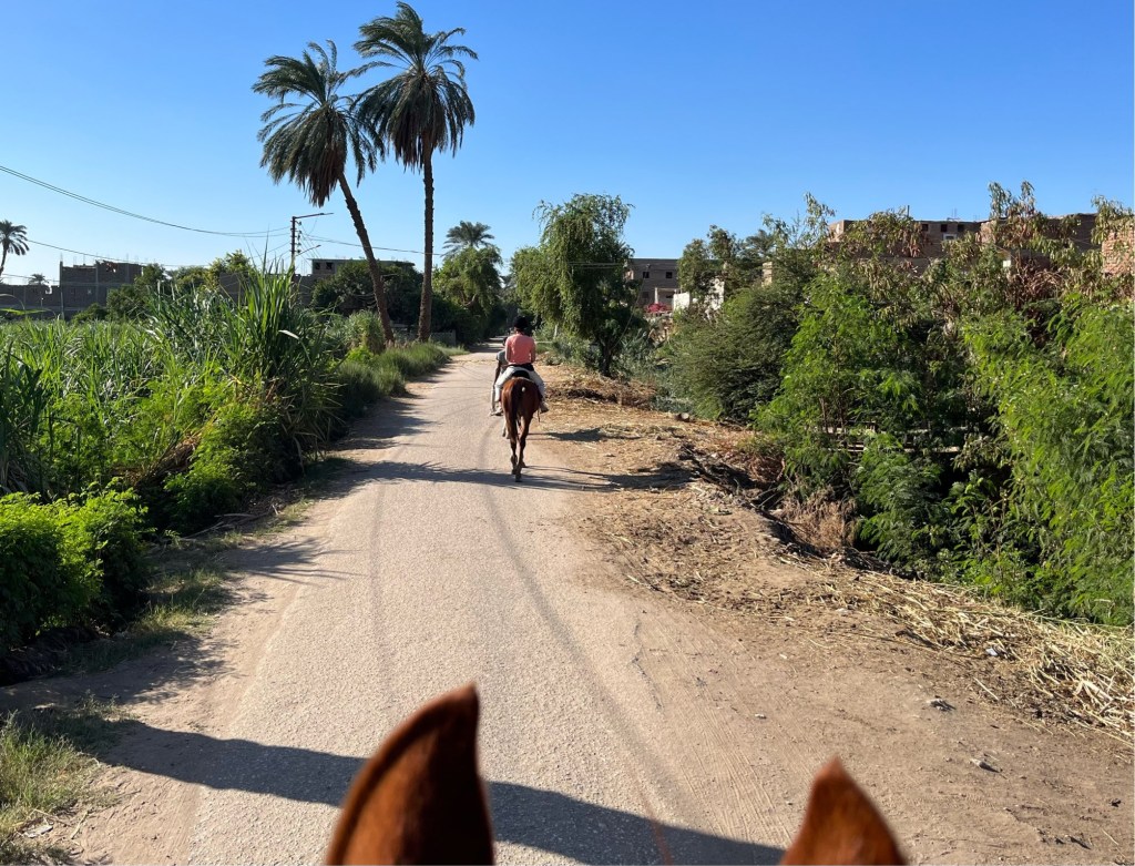 Następnego dnia rano można przyjechać na zachodni brzeg aby wybrac się na wycieczkę konną. W zależności od chęci i wytrzymałosci od 2-4 godzin. Mamy wtedy okazję pooglądac codzienne życie w okolicznych wsiach, na polach i wzdłuż brzegu Nilu. Leniwa i relaksująca aktywność na zadbanych koniach. Nie wierzy mi Pani bo widziała co się dzieje w Luksorze na drugim brzegu. Tak, plaga dorożek pędzących po ulicach wśród uderzeń bata to z punktu widzenia traktowania koni i ich wręcz agonalnego stanu po prostu patologia. Ale, chociaż będzie to trudne z racji bardzo natrętnego nagabywania, możemy po prostu z nich nie korzystać.