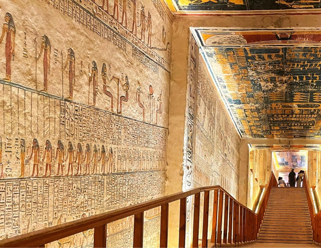 Jeżeli jeszcze Pani będzie wyrażała chęć obcowania z grobowcami to możemy na koniec odwiedzić Dolinę Królowych – wbrew nazwie oprócz królowych sa tutaj pochowani również synowie faraonów. Zwykle ich postacie można rozpoznać po zwisającym z jednej strony głowy bujnym warkoczu a może nawet puklu jak sama Pani podpowiada. Jak również po tym, że prowadzi go jego tata faraon w charakterystycznej koronie. Podobnie i tutaj mamy 3 grobowce w cenie biletu i gwarancję, że nie będzie tłumów.
