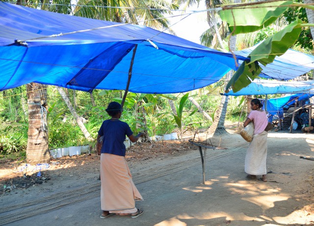 Obowiązkowym punktem programu jest wizyta w jednym z wielu miejsc, w których wyrabia się maty, kosze lub liny z włókien kokosa. Co nie dziwi – wokół gdzie okiem sięgnąć otaczają nas palmy kokosowe. Często widać sterty skorup kokosowych. Po namoczeniu ze skorup oddziela się sie włókna kokosowe, które potem po wysuszeniu używane są do zaplatania bardzo wytrzymałych lin. Cały proces odbywa się ręcznie. Najpierw na elektrycznym wrzecionie zaplata sie włókien cienkie około 10m sznurki, które potem przy pomocy ręcznego kołowrotka nawijane są na siebie tworząc grubą linę.